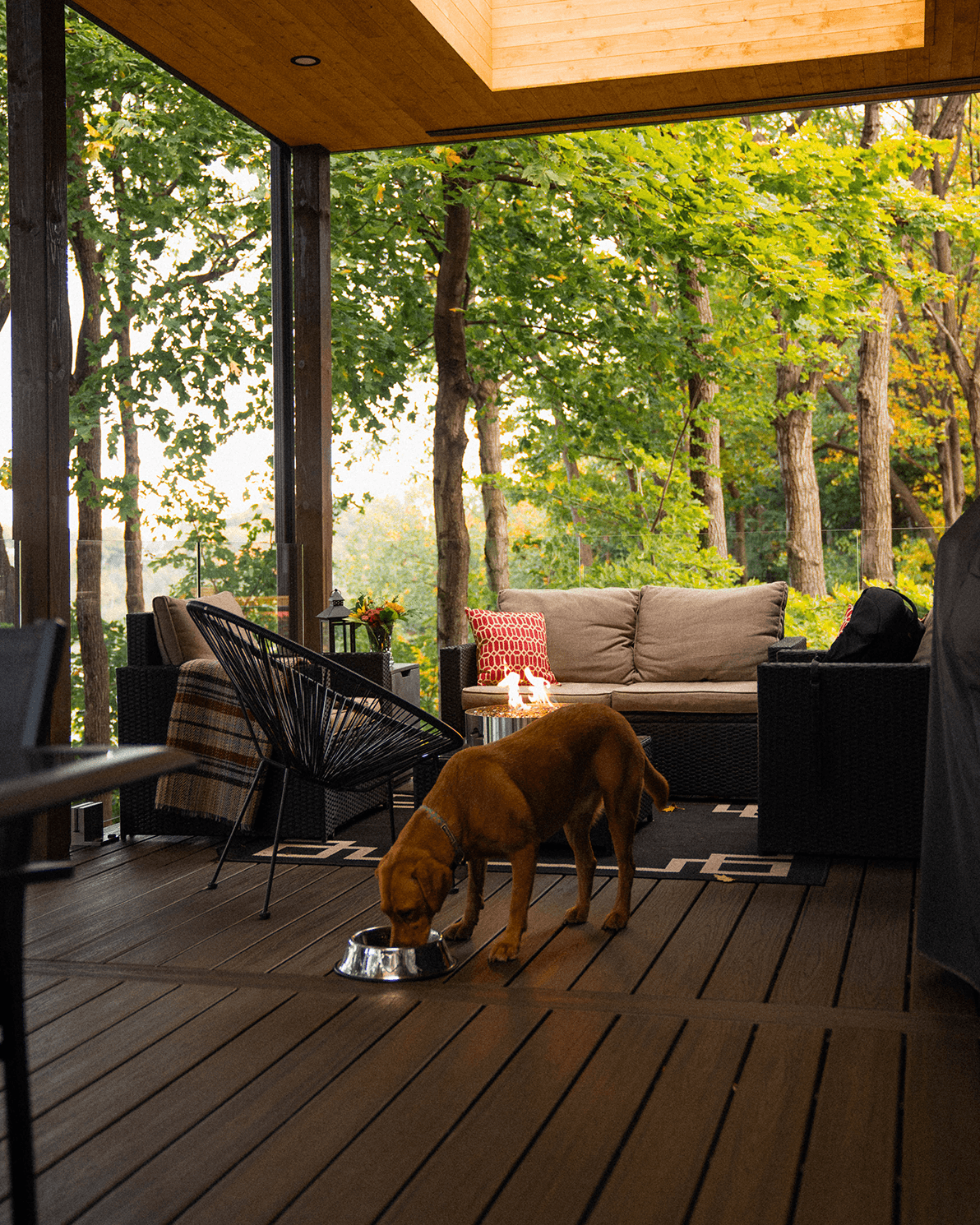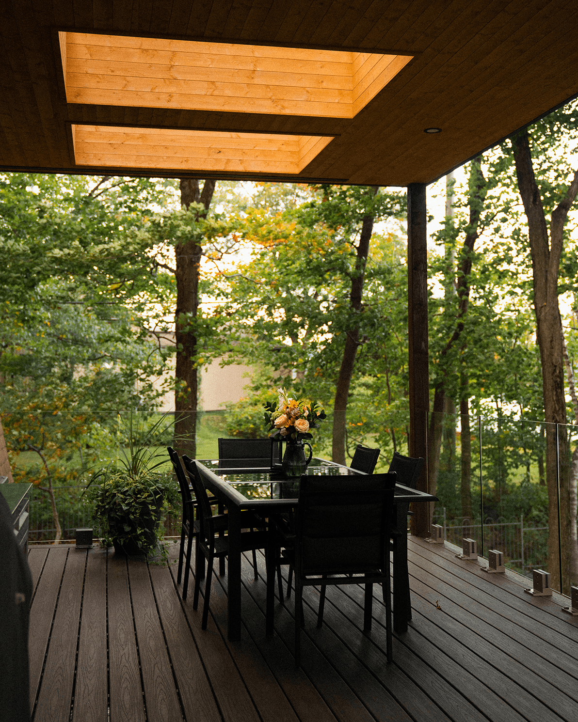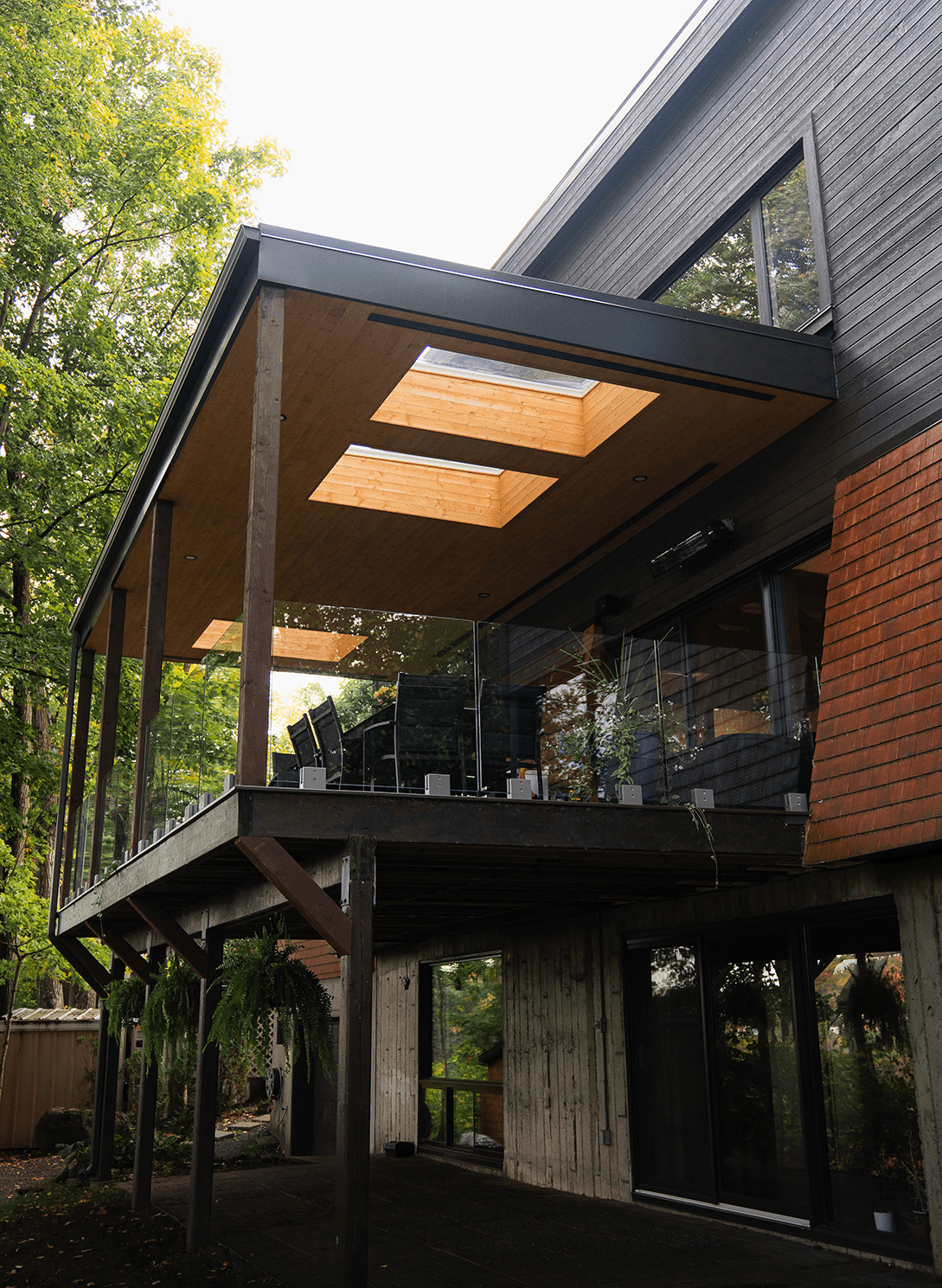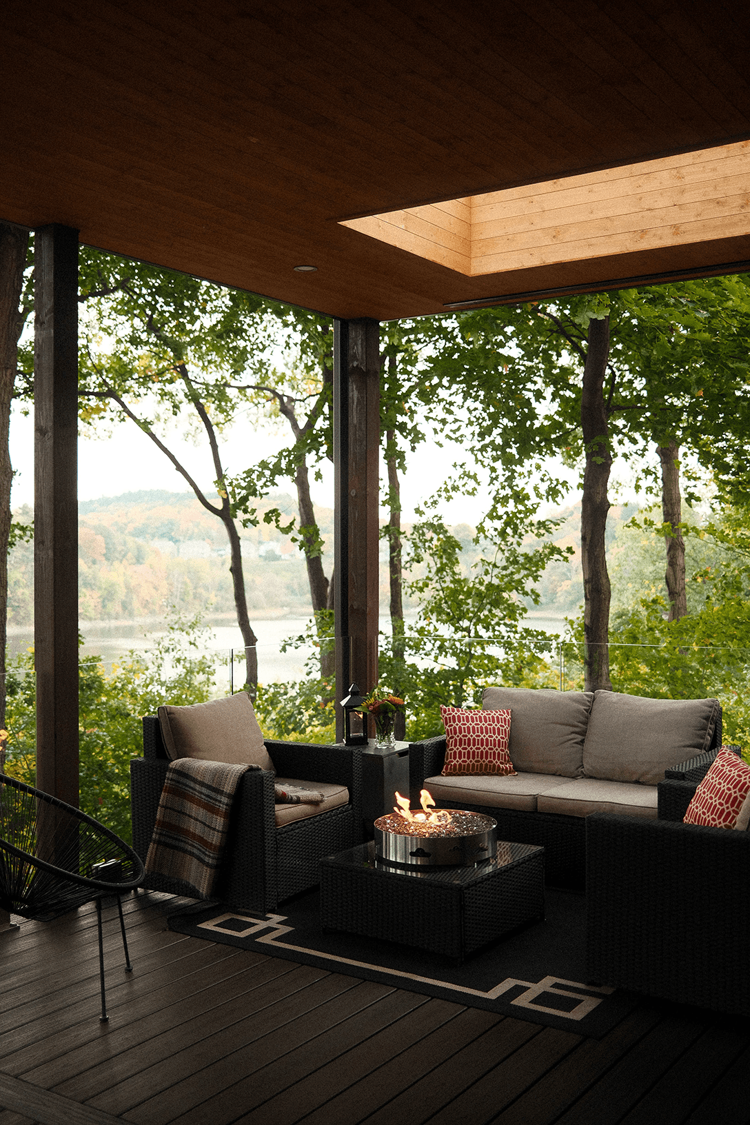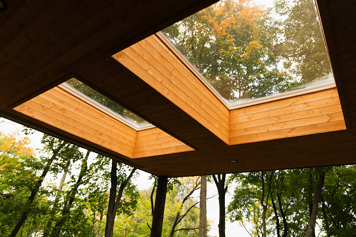 Dans le but de maximiser l’entrée de lumière naturelle, nous y avons ajouté trois puits de lumière, un haut plafond de lambris de bois et des garde-corps en verre complété par un revêtement de plancher en composite sans entretien, estompant ainsi la frontière entre l’intérieur et l’extérieur, invitant le paysage à entrer dans les lieux.