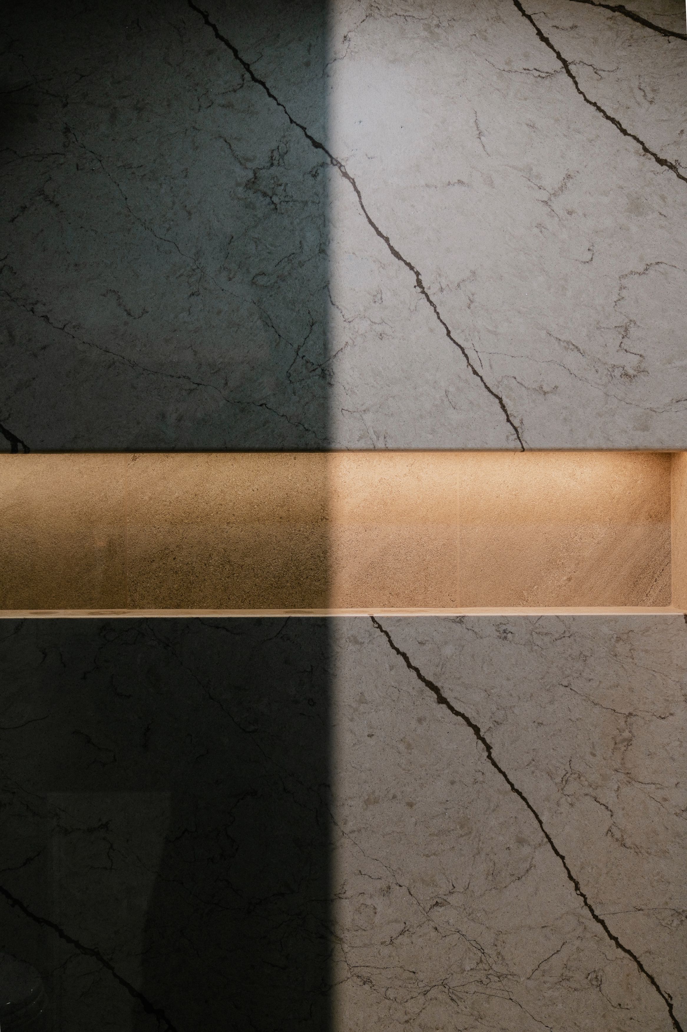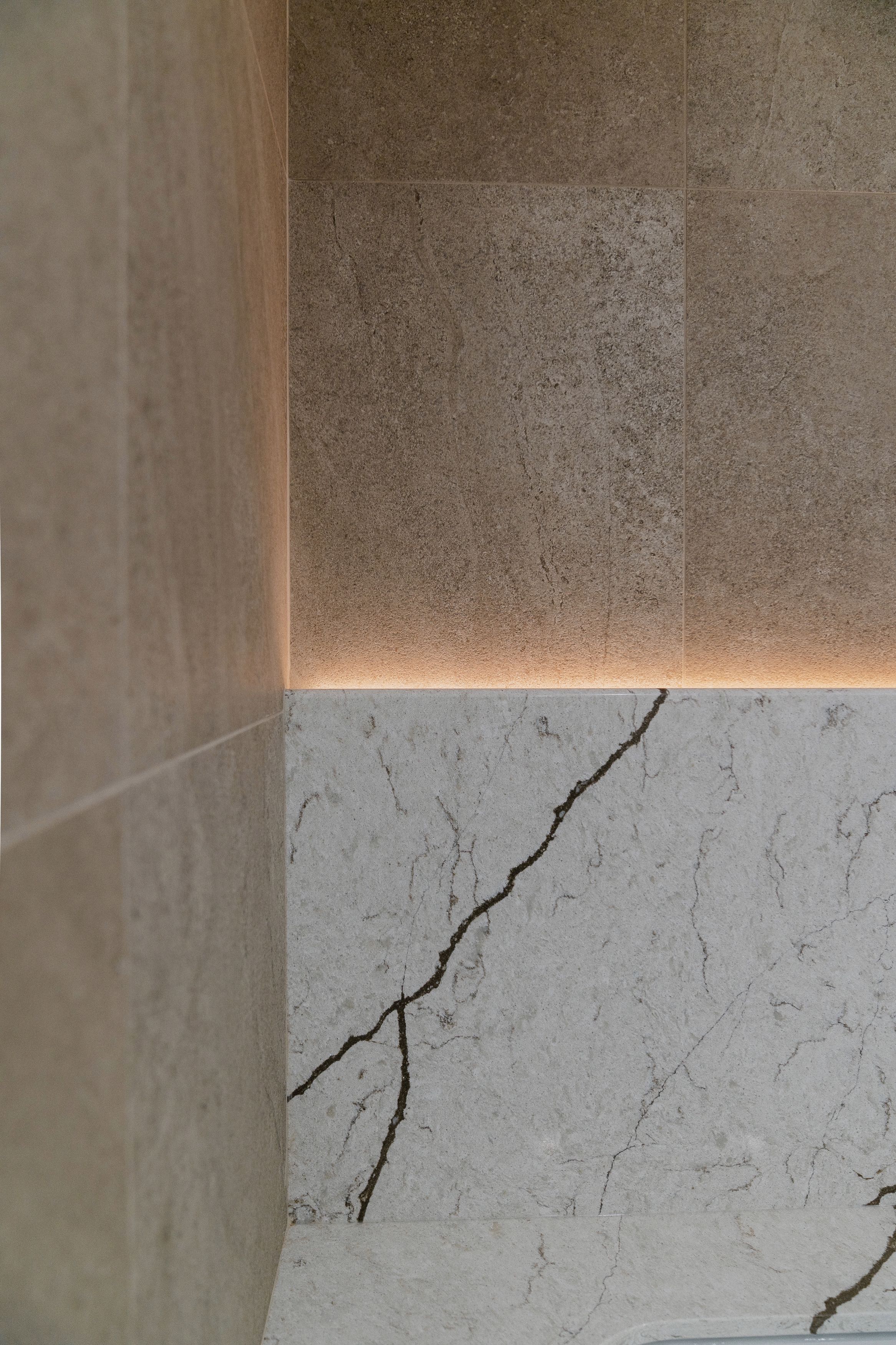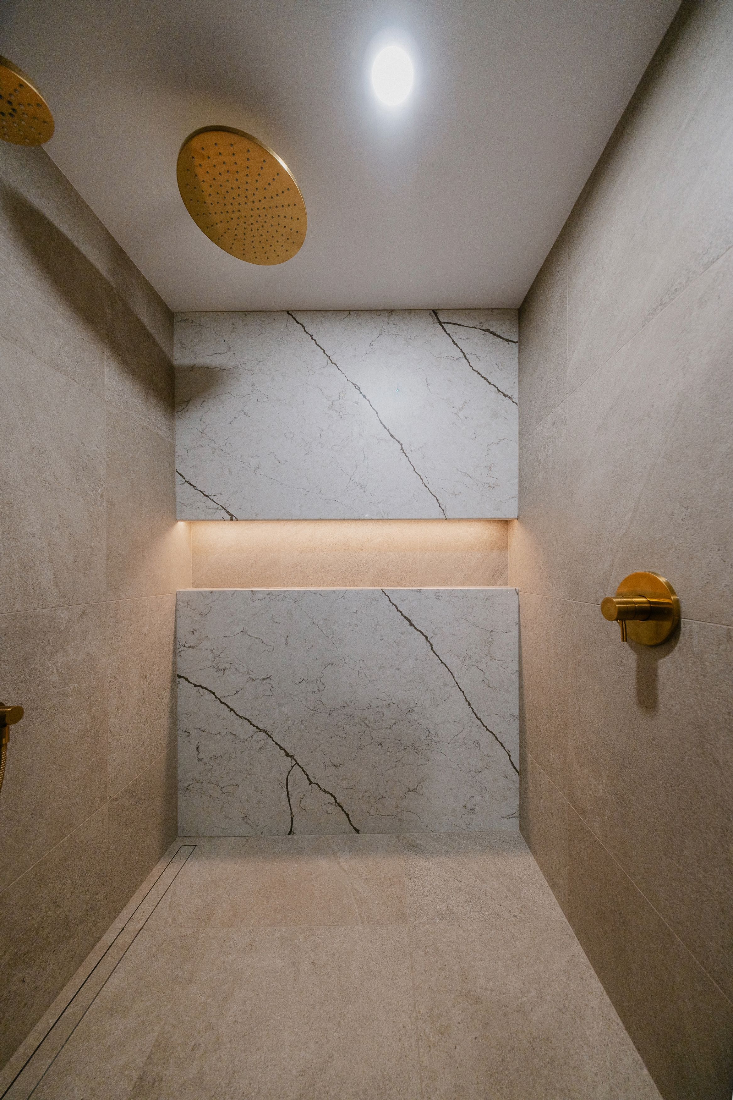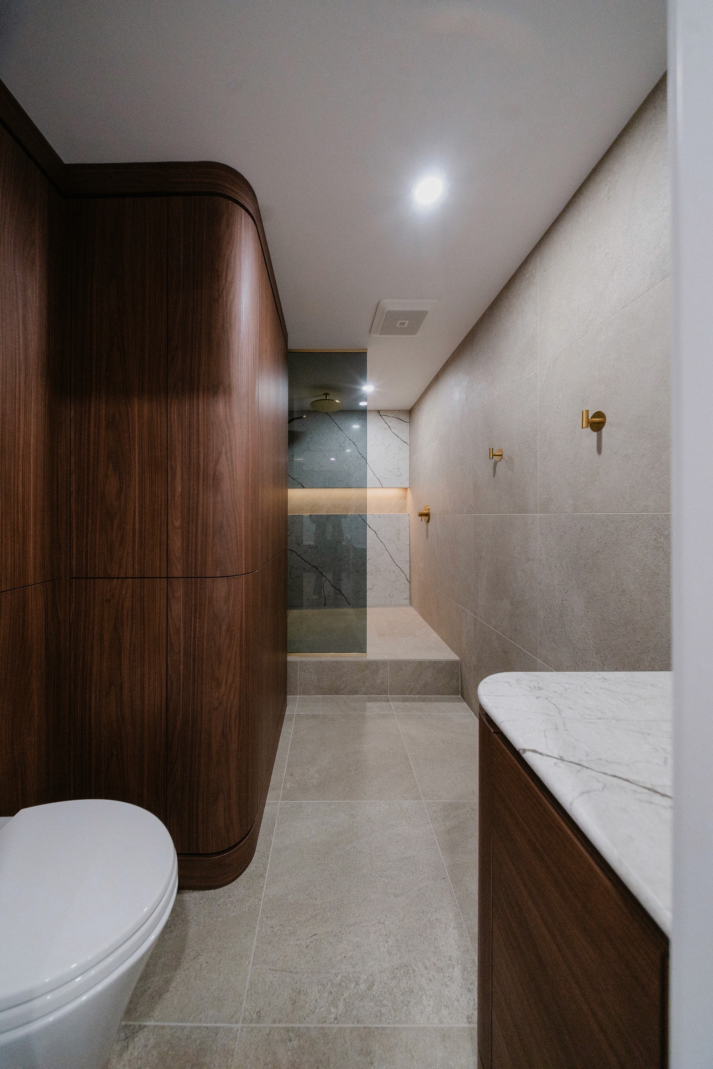 Un travail minutieux a été porté au mobilier intégré, développé sur mesure pour optimiser le rangement tout en ajoutant un côté esthétique à la pièce. L’agencement des matériaux — entre céramique, porcelaine et robinetterie — participe à créer un équilibre raffiné, à la fois sobre et distinctif.