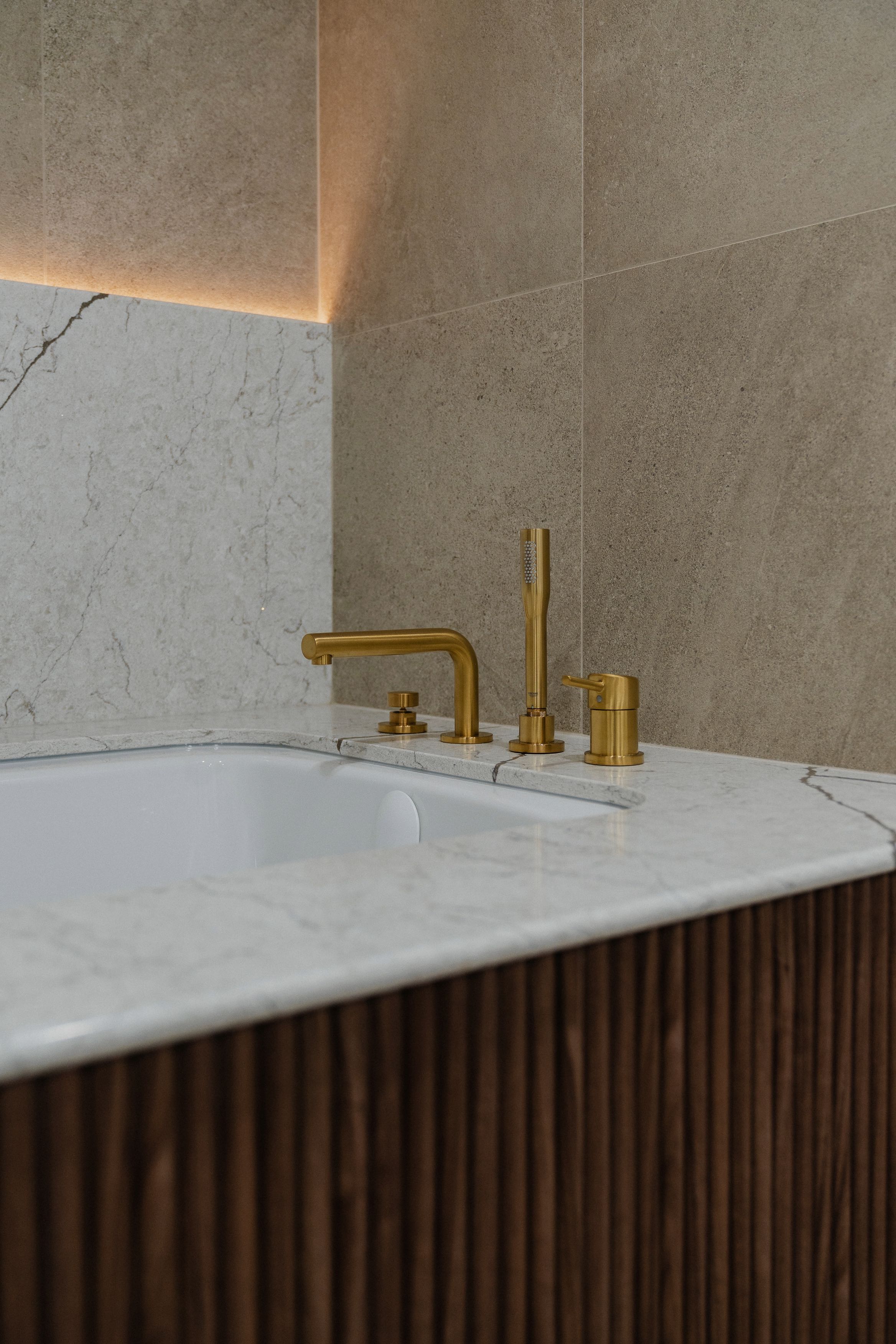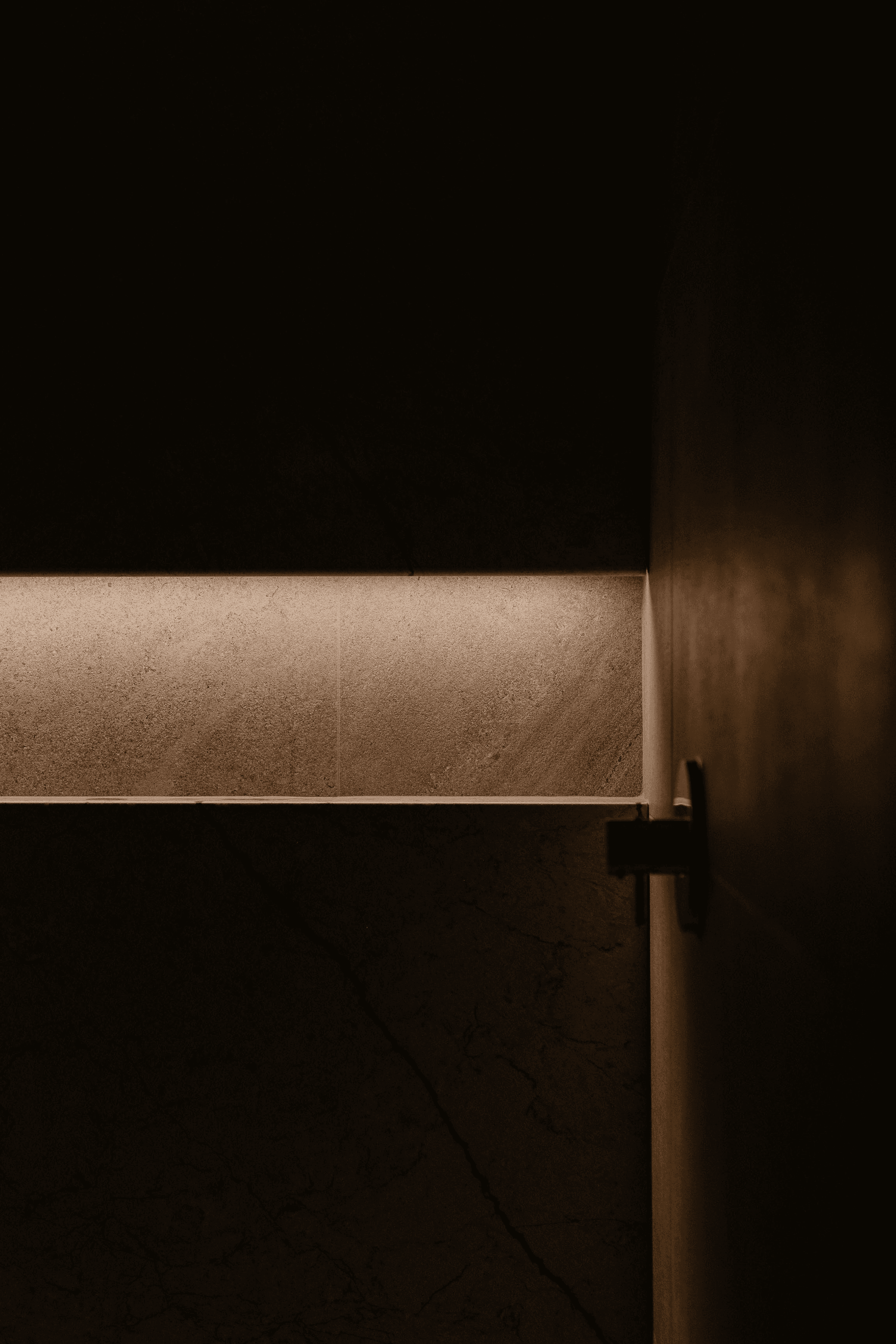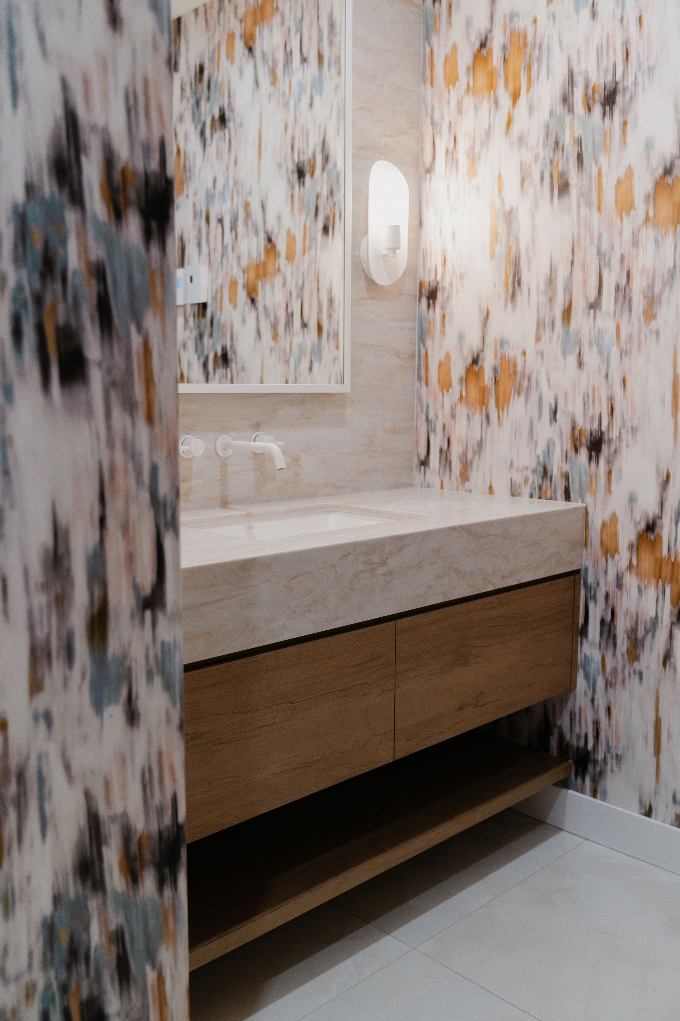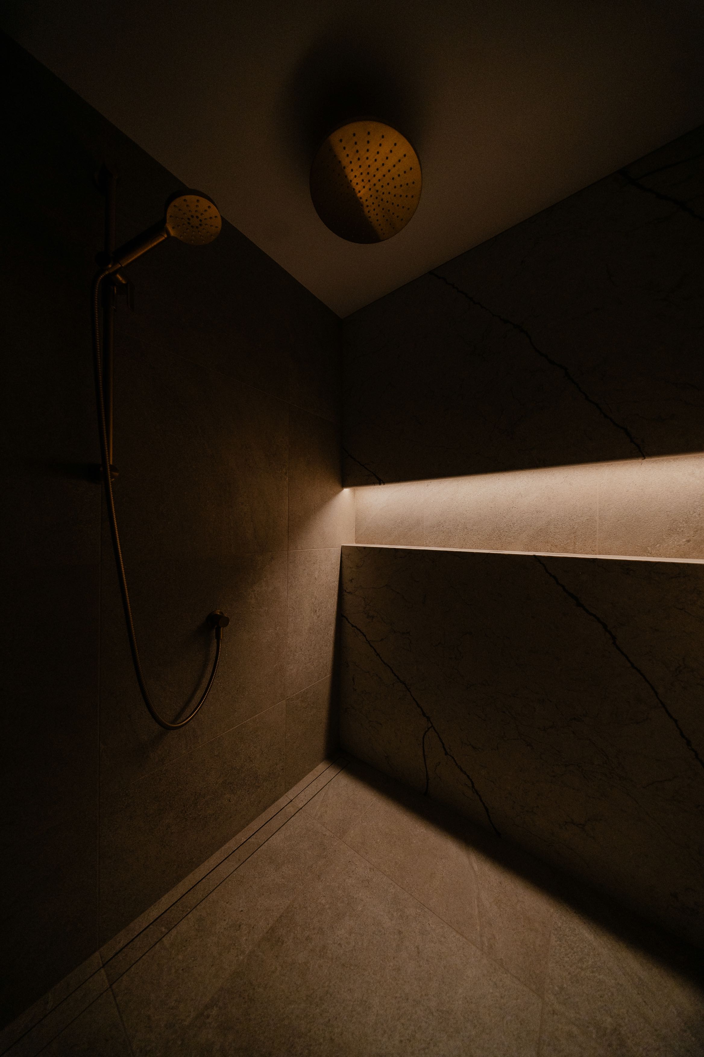 Un travail minutieux a été porté au mobilier intégré, développé sur mesure pour optimiser le rangement tout en ajoutant un côté esthétique à la pièce. L’agencement des matériaux — entre céramique, porcelaine et robinetterie — participe à créer un équilibre raffiné, à la fois sobre et distinctif.